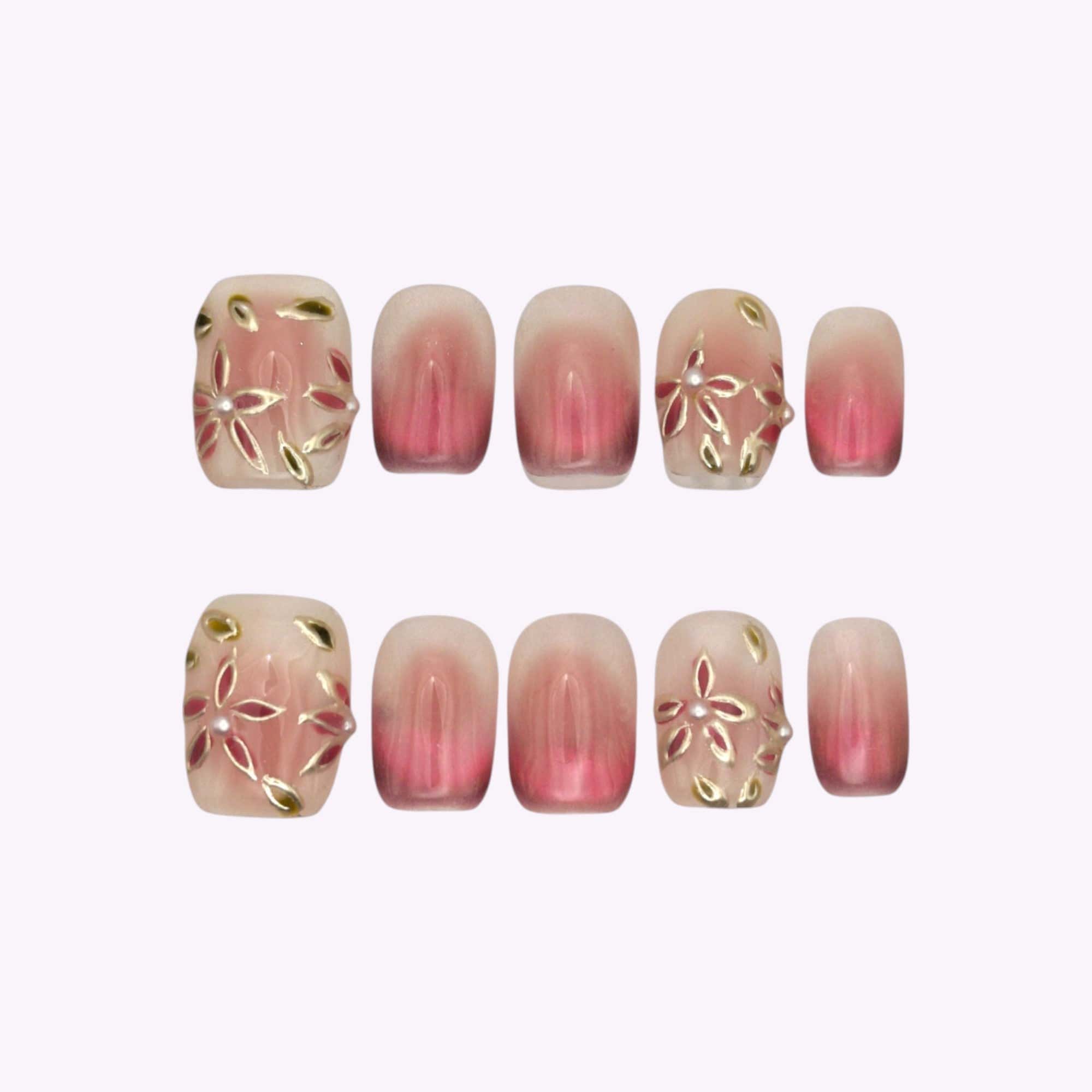 Golden Blush è un set press-on che cattura la grazia e la delicatezza di un rosa soft con un finish shimmer luminoso. Perfetto per chi cerca uno stile sottile ma sofisticato, questo design aggiunge un tocco di eleganza eterea, rendendo ogni momento speciale.