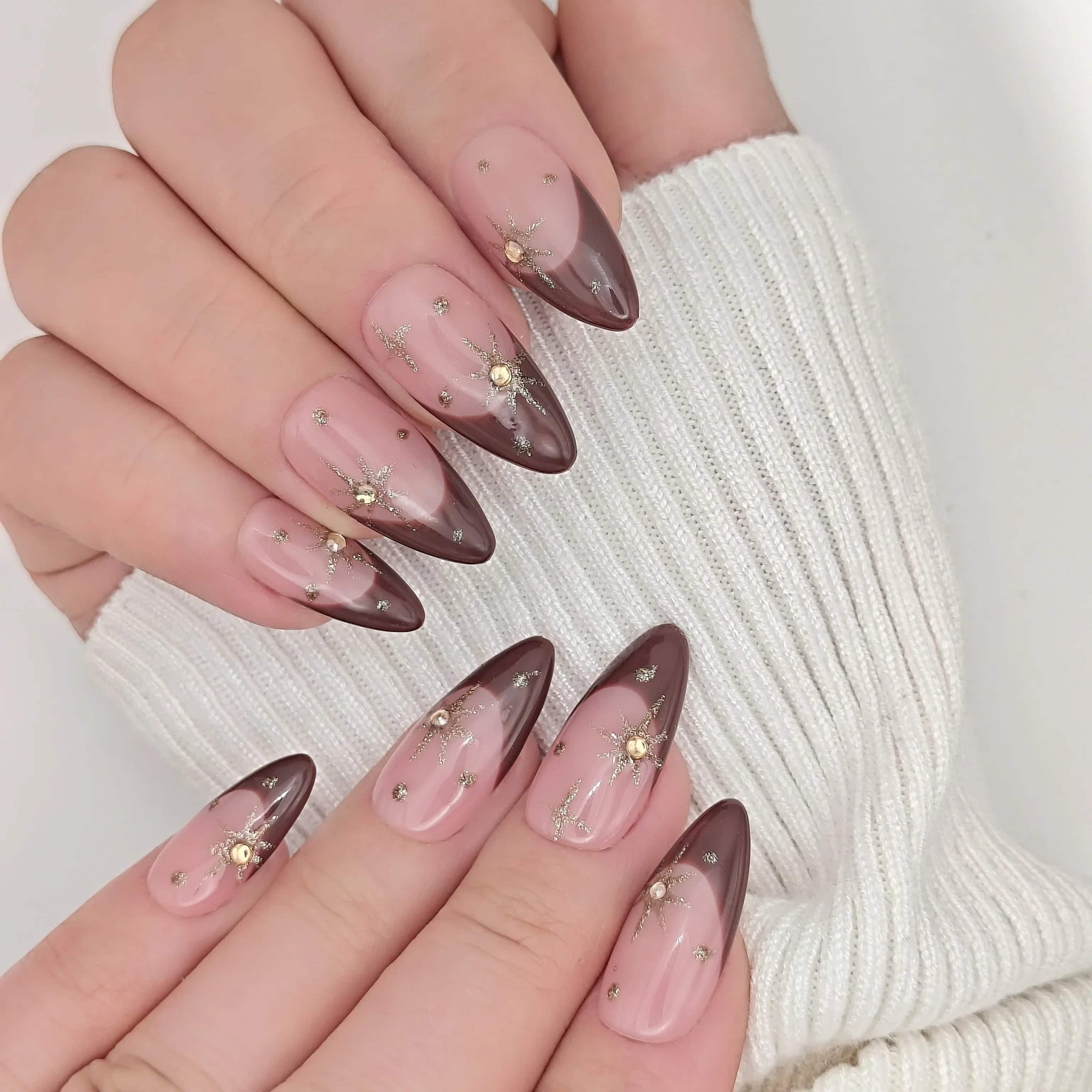 Trasforma il tuo look in pochi minuti con le nostre press-on nails fatte a mano. Realizzate con una base rosa elegante, completata da french marrone e dettagli scintillanti in oro che richiamano un cielo stellato, queste unghie offrono stile e praticità. Facili da applicare e riutilizzabili, sono perfette per ogni occasione. Ottieni un risultato da salone comodamente da casa.